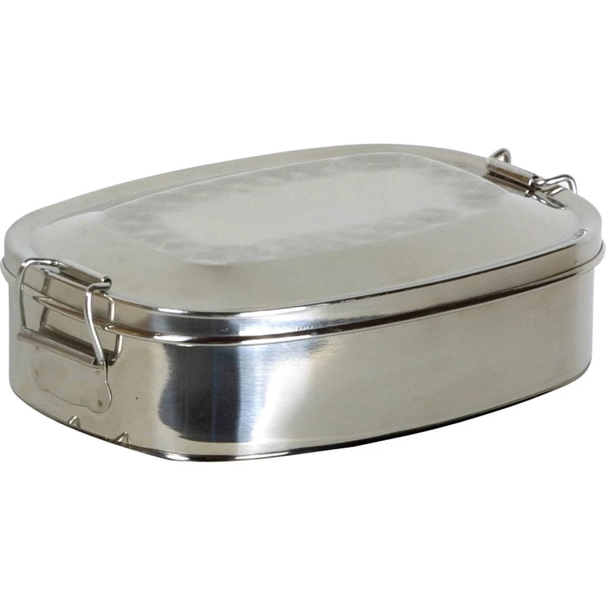 Proviant-Dose von Basic Nature in der großen Ausführung. Praktische Proviantdose aus Edelstahl. Der Deckel wird mit 2 Roll-Klammern auf der Dose gehalten. Perfekt für Brote, Obst oder Proviant. Aber auch für Kleinzeug, Fotozubehör, Erste Hilfe Sets, als Spardose oder für das Schuhputzzeug geeignet. Kann zur Not auf Flammenkochern benutzt werden – dann den Deckel nicht befestigen. Ohne Dichtung.