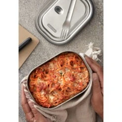 Die Stainless Steel Lunchbox 600 ml von black+blum ist eine Edelstahl-Lunchbox, die dank eines sicheren vakuumversiegelten Verschlusses 100% auslaufsicher ist. Ausgetattet mit einer Edelstahl-Gabel und einem elastischen Silikonband. Der Deckel aus Edelstahl ist mit Silikon umspritzt, um auslaufsicher und leicht zu reinigen zu sein. Ein Ventil auf der Oberseite bietet auslaufsichere Funktionalität: Ventil hochziehen zum Öffnen und nach unten drücken, um es sicher zu schließen. Das Silikonband gibt zusätzliche Sicherheit, dass sich der Deckel nicht ungewollt öffnen kann. Die Gabel aus rostfreiem Stahl wird einfach und sicher von dem Silikonband gehalten. Die Stainless Steel Lunchbox ist eine 100% plastikfreie und absolut dichte Box mit 3-in-1 Multifunktionalität: Lunchbox, Ofenform und Vorratsdose. Das bedeutet, dass in der Lunchbox Mittagessen transportiert, Gerichte im Ofen zubereitet oder vorgekochte Gerichte im Gefrierschrank aufbewahrt werden können.
