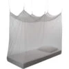 Kastenförmiges Moskitonetz Fine Mesh Box (alter Name: Nordic II) Modell 2 von Brettschneider für eine bis zwei Personen aus feinstem und besonders leichtem Polyamid. Der dünne Faden ermöglicht – trotz der kleinen Maschenweite – eine verhältnismäßig gute Luftzirkulation. Rundum geschlossen. Das Moskitonetz hat keinen seitlichen Eingang, man hebt es kurz an um unter das Netz zu kommen. Ein zusätzlicher Eingang birgt die Gefahr, dass man diesen aus Versehen nicht schließt und somit Mücken und andere Flugwesen in das Netz gelangen können.