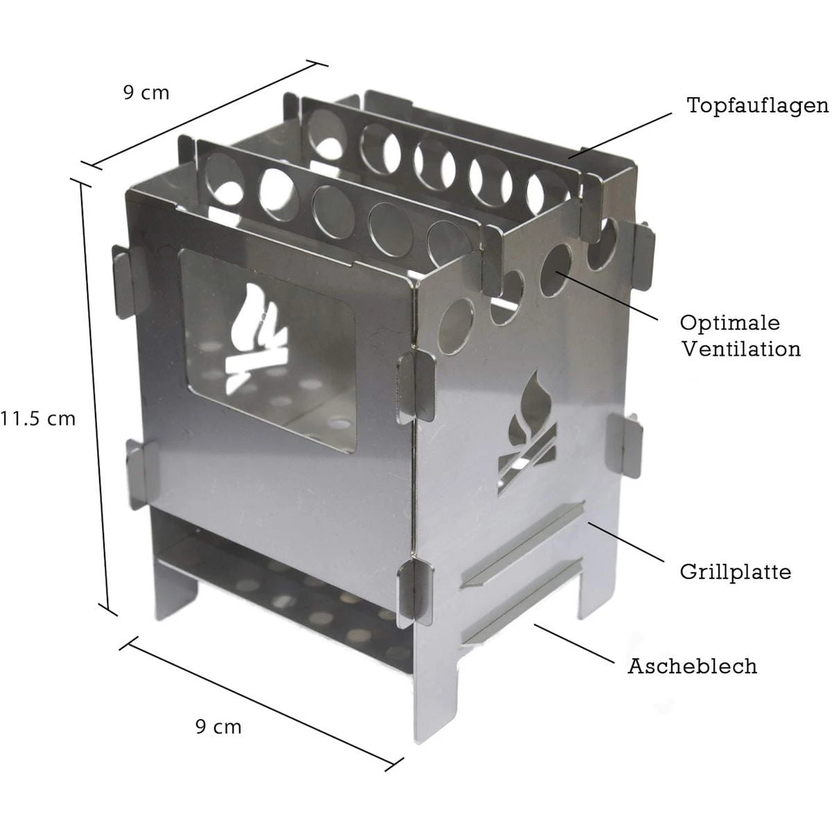 Die BushBox von bushcraft essentials ist ein kleiner, handlicher und preisgünstiger Steck-Hobo Kocher. Aus rostfreiem Edelstahl (1.4301) und trotzdem nur 260 Gramm leicht (einschließlich Tasche), passt mit 9×11,5 cm in jede Hosentasche und liefert mit kleinem Budget eine Riesen-Leistung. Mit integrierter Aschepfanne als Bodenschutz. Durch die mitgelieferten Topfauflagen für jede Tassengröße oder auch als Grill verwendbar. Alternativ auch einsetzbar mit Trangiakocher, Brennpaste, Esbit etc. (jeweils separates Zubehör) oder auch als Windschutz für Brenner. Der Kocher ist komplett in Deutschland hergestellt. Die aktuelle Version der Bushbox hat zwei mitgelieferte Topfauflagen und eine Baumwolltasche (als Umverpackung, eine robuste Outdoor-Tasche haben wir zusätzlich im Angebot). Manche Videos beziehen sich auf eine ältere Version der Bushbox. Das komplette Ausrüstungsset in der meistgekauften Kombination: der Outdoor-Kocher Bushbox, ein Grillblech (verwendbar als Grill, Trangia-Plattform, Einlage für Holzkohle) und strapazierfähige Outdoor-Tasche – im Set günstiger!