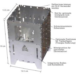 Zubehör: Als spezielles Zubehör zur Bushbox XL ist eine (nicht im Lieferumfang enthaltene) Grillplatte erhältlich, so dass die Bushbox XL auch als Grill nutzbar ist. Auch Topfauflagen können zusätzlich bestellt werden. Das komplette Ausrüstungsset in der meistgekauften Kombination: Bushbox XL, Universalrost (verwendbar als Grill, Trangia-Plattform, Einlage für Holzkohle) und strapazierfähige Outdoor-Tasche – im Set günstiger!