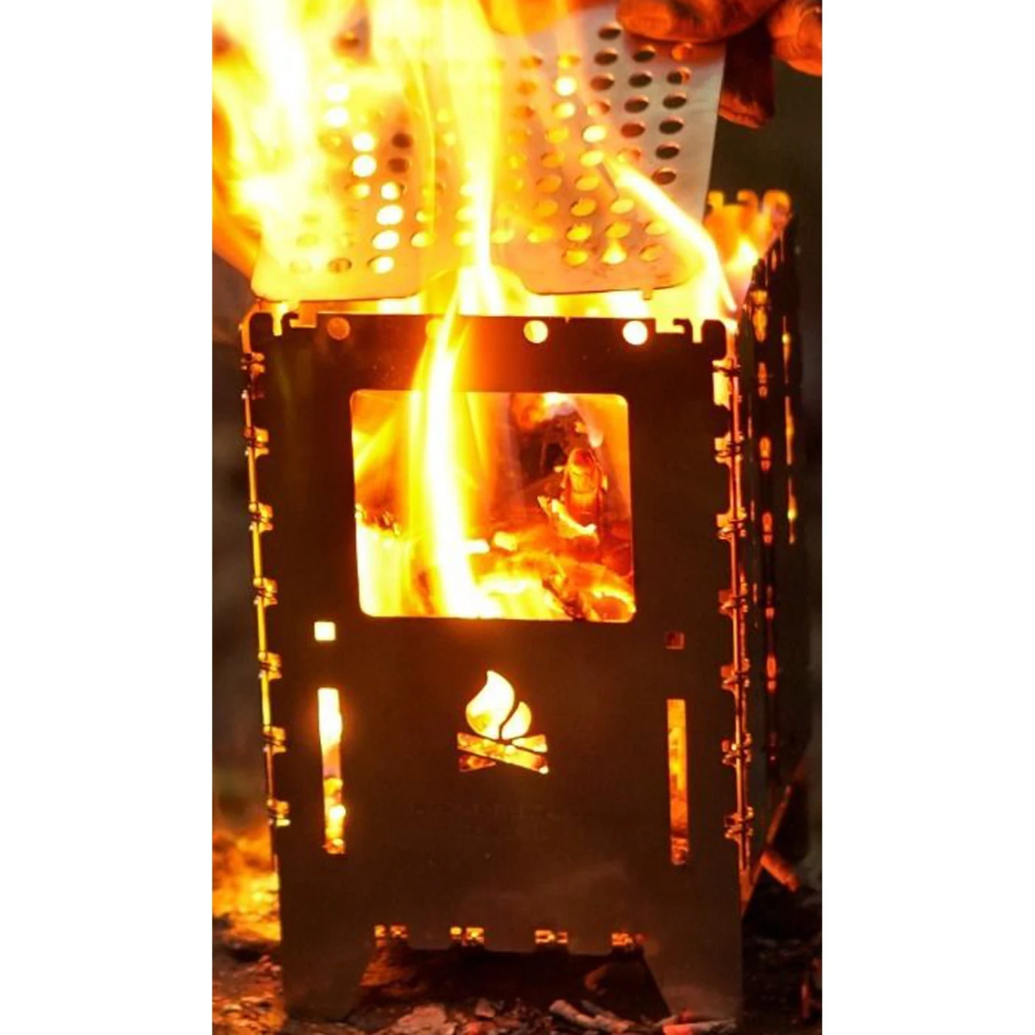 Der Bushbox XL von bushcraft essentials ist ein außerordentlich effizienter portabler Falt-Hobo-Kocher zum Grillen, Kochen, Wärmen. Zusammengefaltet nur ca. 1 cm dick. Perfekt für längere Outdoor-Trips, Camping, Trekking, Bushcraft, Biker, Expeditionen und und und… Unabhängig, vielfältig und einfach zu benutzen. Den Brennstoff gibt es kostenlos überall in der Natur – Zweige, Äste, Laub, Tierdung. Halteposition für Trangia Kocher. Zusammengeklappt ist dieser geniale Hobo-Ofen nur wenig dicker als 1 cm und lässt sich nahezu überall unterbringen. Der Bushbox XL wird an den Scharnieren einfach aufgeklappt und ist sofort einsatzbereit (er lässt sich auch mit Handschuhen oder klammen Händen problemlos aufbauen, was bereits auf Expeditionen unter Beweis gestellt wurde). Der Bushbox XL arbeitet nach dem Kamin-Prinzip: Luft strömt von unten in den Kocher, bringt sogar noch feuchtes Material zum Brennen und erzeugt starke Hitze, was weiter dadurch unterstützt wird, dass die Hitze im Gegensatz zu einer offenen Flamme kaum nach den Seiten abstrahlen kann und dadurch vorwiegend nach oben gelenkt wird. Der Bushbox XL ist ein Effizienzwunder. Schon mit wenigen kleinen Zweigen lässt sich Wasser in unter 4 Minuten zum Kochen bringen, Fleisch grillen, Essen zubereiten – und vieles mehr. Als Brennstoff kann neben praktisch jedem natürlichen bzw. festen Brennstoff wie Holz, Rinde, Holzkohle (sogar trockner Tierdung) auch ein Spiritusbrenner, Esbit-Tabletten oder ein Gel-Kocher verwendet werden. Durch zwei mitgelieferte Stäbe kann eine externe Wärmequelle (z.B. Trangia) auf jeder beliebigen Höhe in der Bushbox XL plaziert werden. Diese Stäbe lassen sich auch auf der Oberseite des Kochers einlegen, so dass auch kleine Gefäße erhitzt werden können. Die mitgelieferten, äußerst variabel einsetzbaren Topfauflagen können alternativ verwendet werden als Höhenregulierung beim Einsatz anderer Wärmequellen, Haltestäbe zum Transport oder Versetzen des heißen Kochers und Halterung für den Trangia-Brenner. Nutzern, die das Bushbox XL Profi Set in Kombination mit Trangiakochern verwenden möchten, empfehlen wir die Bestellung eines ZUSÄTZLICHEN Topfauflagen-Sets.