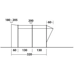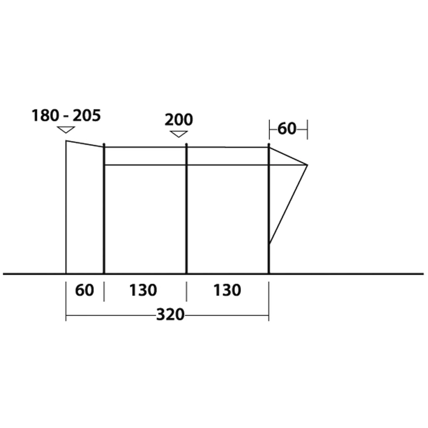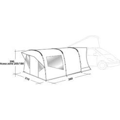 Ein freistehendes Vorzelt in Tunnelbauweise für Wohnmobile, MPV und Busse. Wird mit zwei vorgebogenen Gestängebögen aufgebaut und durch zwei Stahlstangen im Inneren stabilisiert. Das Zelt hat wegen der großen Fensterflächen eine gute Aussicht zu bieten und ist hell und geräumig. Die Fenster sind mit Vorhängen ausgestattet. Der Boden ist wannenförmig hochgezogen um Schutz vor Feuchtigkeit und Insekten zu bieten. An der Rückseite ist eine Doggingzone, welche ein bequemes Rangieren des Autos an das Zelt ermöglicht. Das Verbindungsteil zwischen Auto und Zelt wird dann einfach über das Auto gezogen und befestigt.