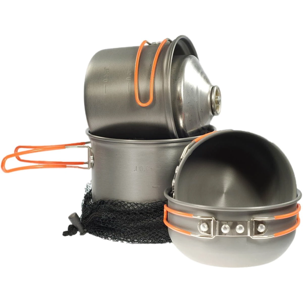 Topfset aus zwei beschichteten Aluminium-Töpfen mit Deckel und Schwamm. Das Aluminium wurde harteloxiert und ist damit kratzfest und robust für den Einsatz draußen.