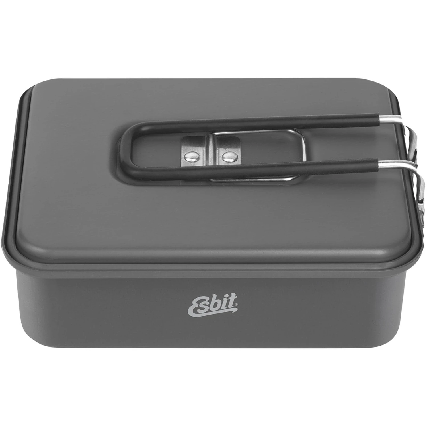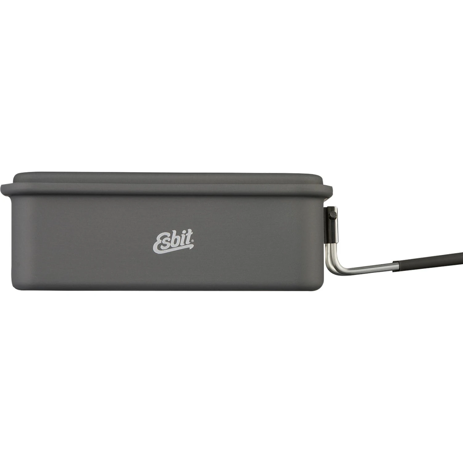 Der Aluminium Topf PT1200HA von Esbit ist aus extrem leichtem, hartanodisiertem Aluminium, fasst ca. 1.200 ml und ist ideal für 1-2 Personen. Der handliche Griff aus 18/8 Edelstahl mit Silikonummantelung sorgt für Sicherheit und Komfort beim Kochen und lässt sich praktisch und platzsparend hochklappen. Der Deckel lässt sich praktischerweise beim Kochen direkt am Rand des Topfes aufhängen. Das Volumen wird im Inneren des Topfes in ml und oz angegeben. Der flache, rechteckige Topf ist ideal zum Verstauen im Gepäck und kann auch als Pfannenersatz verwendet werden. Der Aluminium-Topf bietet im Inneren zusätzlichen Platz zur Aufbewahrung z.B. von Besteck oder eingepackten Mahlzeiten. Zum Lieferumfang gehört außerdem ein praktischer Netzbeutel.