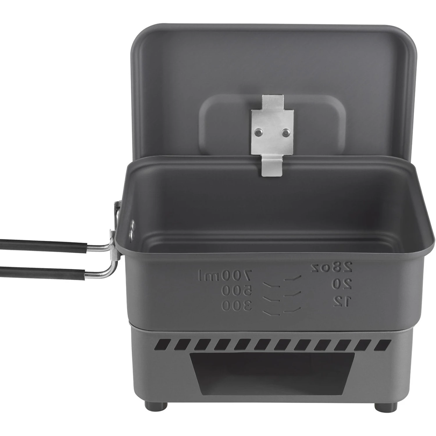 Wenn Gewicht eine Rolle spielt, ist das Trockenbrennstoff-Kochset CS1100HA von Esbit die richtige Wahl. Etwa 439 g leicht (inkl. Packnetz), aus hart anodisiertem Aluminium und mit Esbit Trockenbrennstoff ganz einfach zu befeuern. Das Kochset lässt sich wahlweise mit 14g oder 27g Esbit Trockenbrennstoff-Tabletten (nicht im Lieferumfang) anfeuern. Der Topf fasst ca. 1.100 ml und hat eine Volumenanzeige in Oz und Liter. Mit praktischer Deckelaufhängung und klappbarem Edelstahlgriff. Neben dem Deckel sowie einem Stand, der sich platzsparend im Topf verstauen lässt, gehört auch ein praktischer Netzbeutel zum Lieferumfang, in dem das komplette Kochset kompakt verpackt werden kann.