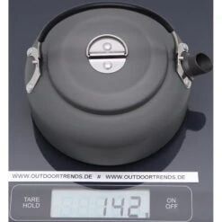 Wasser kochen – ein Grundbedürfnis im Outdoorbereich. Ideal ist hier dieser Wasserkessel aus extrem leichtem und hart anodisiertem Aluminium. Mit ca. 600 ml Volumen (nutzbar 500 ml ansonsten läuft es beim Kochen über) und praktischem Klappgriff. In Verbindung mit dem Stand perfekt für das Esbit-Spirituskocher-Set CS2350WN geeignet. Kann in Esbit-Spirituskocher-Set CS2350WN verstaut werden.