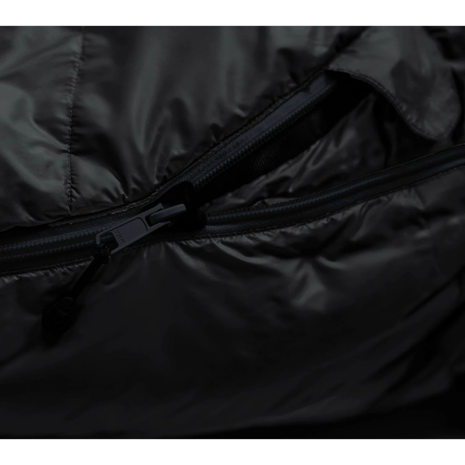 Der Biopod DownWool Subzero 185 von Grüezi Bag in der BLACK EDITION ist ein hochwertiger Mumienschlafsack mit innovativer DownWool Füllung für kühlere Temperaturen. Der 3-Saisonschlafsack ist ein Allrounder unter den leichten Schlafsäcken und optimal zum Wandern, Trekken, Campen und Reisen vom Frühjahr bis in den Herbst hinein. Seine innovative DownWool-Füllung, eine Mischung aus Daune, die für eine angenehme Isolation sorgt, und Wolle, die wie eine natürliche Klimaanlage wirkt, sorgt für ein hervorragendes Schlafklima. Außerdem macht die Wolle den Biopod DownWool Subzero Black Edition unempfindlicher gegen Feuchtigkeit als reine Daune. Der Clou ist der nach unten hin runde Reißverschlussverlauf, durch den man, wenn es mal zu warm wird, bequem seine Füße auf der Oberseite des Schlafsacks ablegen kann. Sehr praktisch ist auch das Kopfkisseneinschubfach, hier einfach eine Fleecejacke einstecken und schon hat man ein unverrutschbares Kopfkissen.