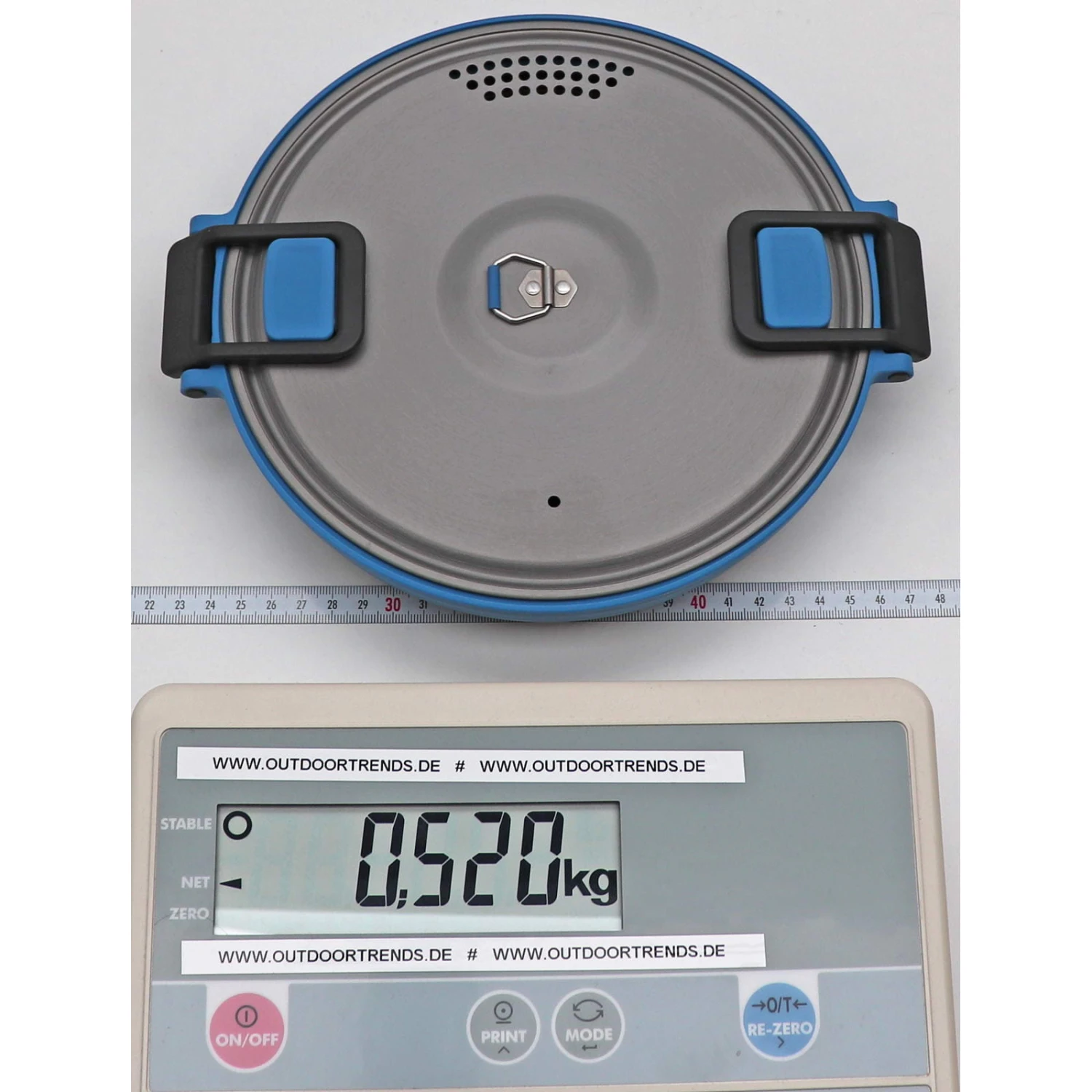 Merkmale: Leicht und robust, hart-anodisierter Aluminiumboden mit Teflon Beschichtung innen; Lebensmittelechte, hitzeresistente Silikonwände; hart-anodisierter Aluminiumdeckel mit eingebautem Sieb; zwei Nylon Griffe; zwei Silikonpads um den Deckel beim Abgießen fest zu halten; Wärmetauscher am Boden; Maßstriche innen; kleiner Deckelgriff zum Abheben