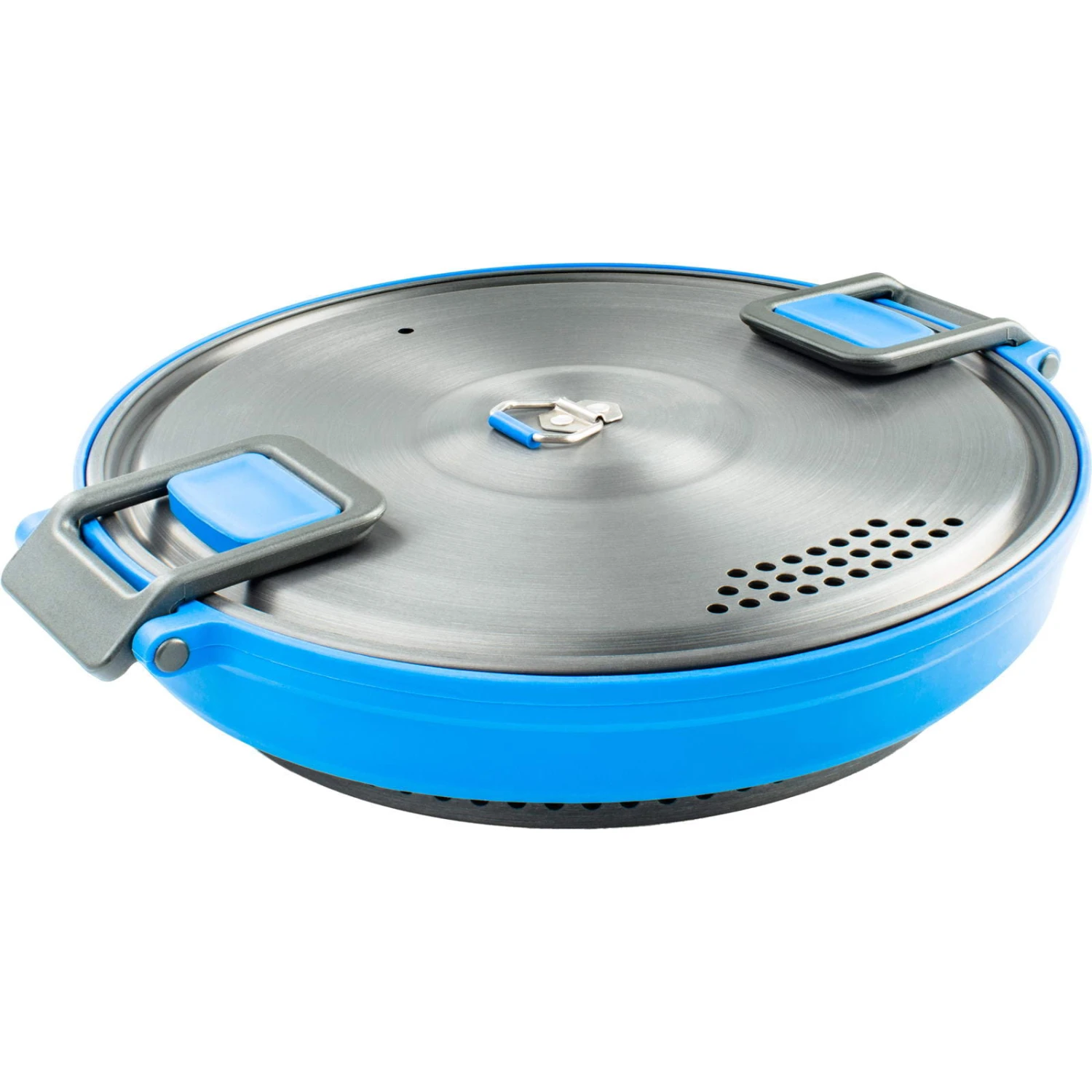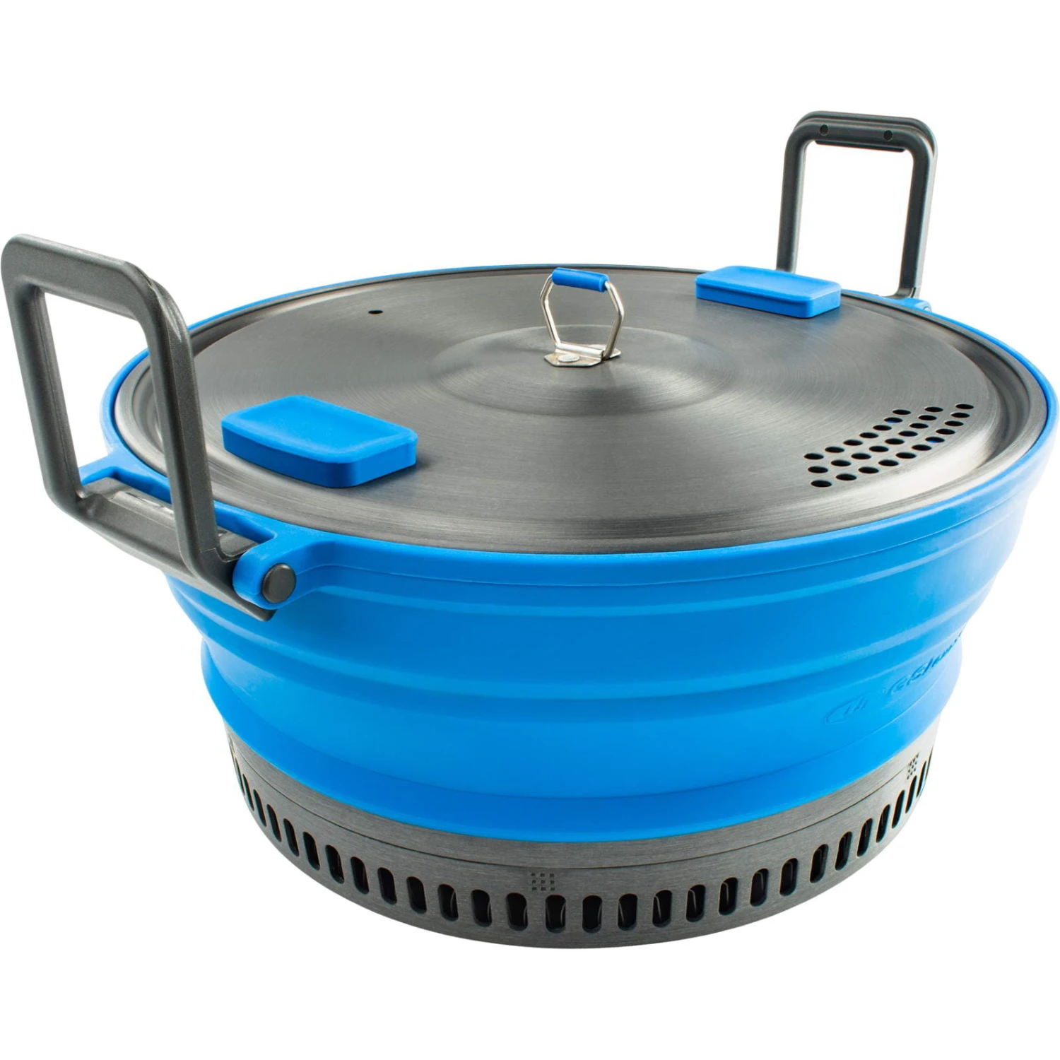 Kochtöpfe können umständlich zu packende Reisebegleiter sein. Der Escape 2 L Pot von GSI ist ein faltbarbarer, voll ausgestatteter Kochtopf, der die Hitzeverteilung von Aluminium mit der Flexibilität von Silikon verbindet. Der hart-aniodisierte Boden mit Wärmetauscher bringt Wasser schnell zum Kochen und der hohe Silikonrand ist exzellent zum Umrühren. Mit seinem 2 Litern Volumen ist der Escape perfekt für ein bis zwei Camper.
