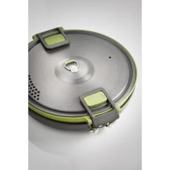 Kochtöpfe können umständlich zu packende Reisebegleiter sein. Der Escape 3 L Pot von GSI ist ein faltbarbarer, voll ausgestatteter Kochtopf, der die Hitzeverteilung von Aluminium mit der Flexibilität von Silikon verbindet Der hart-aniodisierte Boden mit Wärmetauscher bringt Wasser schnell zum Kochen und der hohe Silikonrand ist exzellent zum Umrühren. Mit seinem 3 Litern Volumen ist der Escape perfekt für zwei Camper. Geliefert wird das Set mit einer Ø 22,5 cm Pfanne (Frypan) und zusammen kann alles klein verpackt werden.