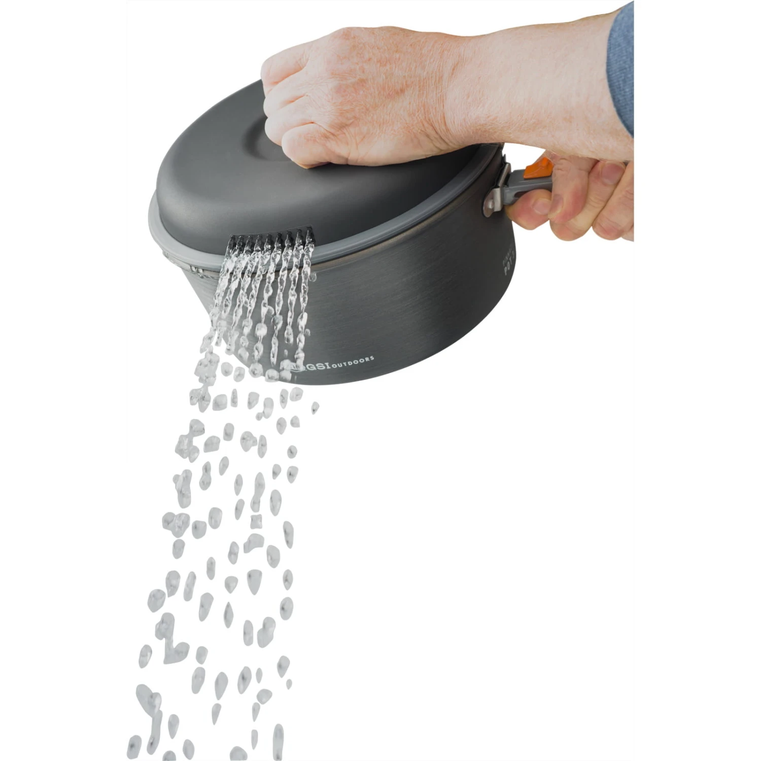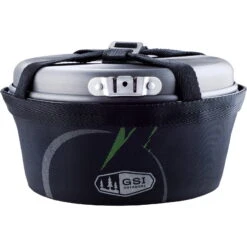 Das Pinnacle Backpacker Kochset von GSI enthält alles, was zwei Personen unterwegs zum Kochen und Essen brauchen, einschließlich der Spülmöglichkeit. Dieses robuste, klein verpackbare und umfangreiche Antihaft-Kochset erhitzt effizient und gleichmäßig, lässt sich leicht reinigen und passt perfekt in die mitgelieferte Packtasche, die auch gleichzeitig als Spüle oder Waschbecken dient. Das Set besteht aus einem 2-Liter-Topf, einer 8-Zoll-Bratpfanne, einem Siebdeckel, einem klappbaren Topfgriff, zwei großen Bechern mit Isolierhüllen und Sip-Through-Deckeln, zwei Schüsseln und einer geschweißten Spültasche. Die Pinnacle-Beschichtung des Topfes und der Pfanne ist äußerst langlebig, kratzfest und erreicht die Temperatur 25% schneller als herkömmliche Antihaftbeschichtungen. Der Siebdeckel erleichtert das Abgießen und der zusammenklappbare Topfgriff sorgt für Sicherheit und Komfort beim Kochen. Die dreieckigen, BPA-freien Becher sind jeweils ineinander genestet. Der Innere ist dabei jeweils als Trinkbecher gedacht und mit einer EVA-Isolierung überzogen sowie mit einem Deckel mit Trinköffnung ausgestattet. Der große Becher eignet sich hervorragend als Schüssel für Suppen oder Haferflocken. Die stabile Aufbewahrungstasche, die auch gleichzeitig als Waschschüssel dienen kann, runden das Pinnacle Backpacker Kochset ab.
