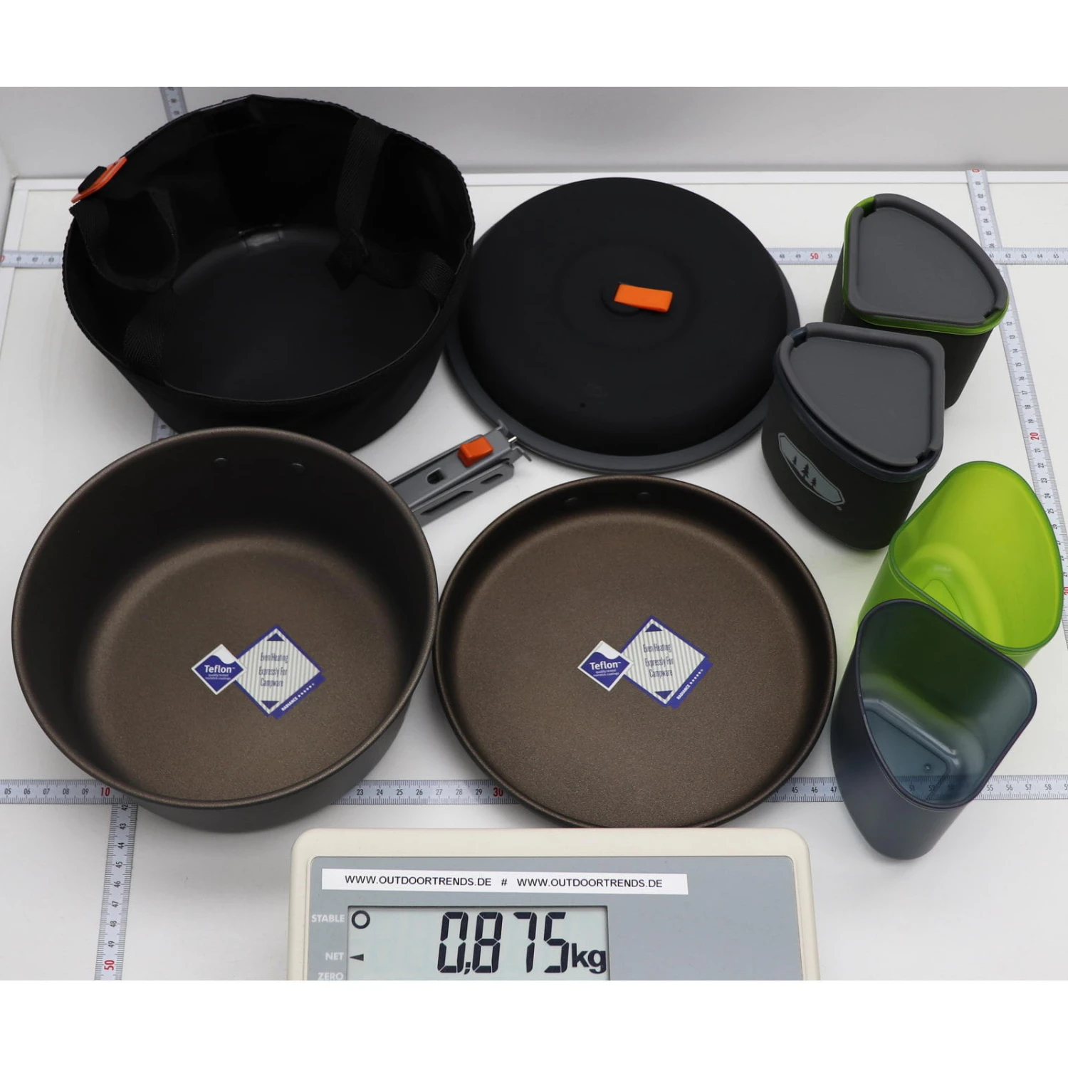 | Merkmale | BPA-freie Becher mit Isolierhüllen und Trinkaufsätzen, das gesamte Set lässt sich kompakt zusammenpacken und leicht transportieren, der bruchsichere Siebdeckel hält die Hitze zurück und erleichtert das Abgießen, der faltbare Topfgreifer sorgt für einen sicheren Halt und lässt sich für den Transport klein zusammenpacken, die BPA-freie Schalen sind leicht, hitzebeständig, passen in die Becher und sind leicht zu reinigen, die spiralförmig gedrehten Böden der Töpfe und Pfannen bieten sicheren Halt auf Herden und Grills, Hochtemperatur-Aluminium, PFOA-freie Teflon®-Antihaftbeschichtung, robuster Packsack mit geschweißten Nähten, auch als Campingspüle verwendbar |
