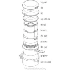 | Volumen ca. | Becher: 400 ml, Pfanne: 750 ml, Topf 1: 2 Liter, Topf 2: 3 Liter |