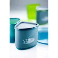 Umfangreiches Aluminium Kochset, welches höchsten Ansprüchen gerecht wird. Die perfekte Beschichtung der Töpfe verhindert ein Verkratzen und ermöglicht komfortables Kochen – fast wie zu Hause. Das Set ist sehr umfangreich ausgestattet und dennoch extrem leicht und platzsparend. Ideal für längere Touren mit mehreren Personen und ideal auch für Caravan, Wohnmobil oder Expedition. Bestehend aus 2 Töpfen, den passenden Deckeln mit Abseihfunktion dazu, einer Pfanne mit abgedrehtem Boden für guten Stand auf dem Kocher, vier Kunststofftellern und den farblich passenden Tassen und Schüsseln. Tassen jeweils mit isolierendem Neoprenmantel und Durchtrink-Deckel, nestbar in den Schüsseln. Die klappbare, stabile Griffzange sowie die Transporttasche, die auch als Waschschüssel benutzbar ist, runden dieses durchdachte und perfekte Set ab.