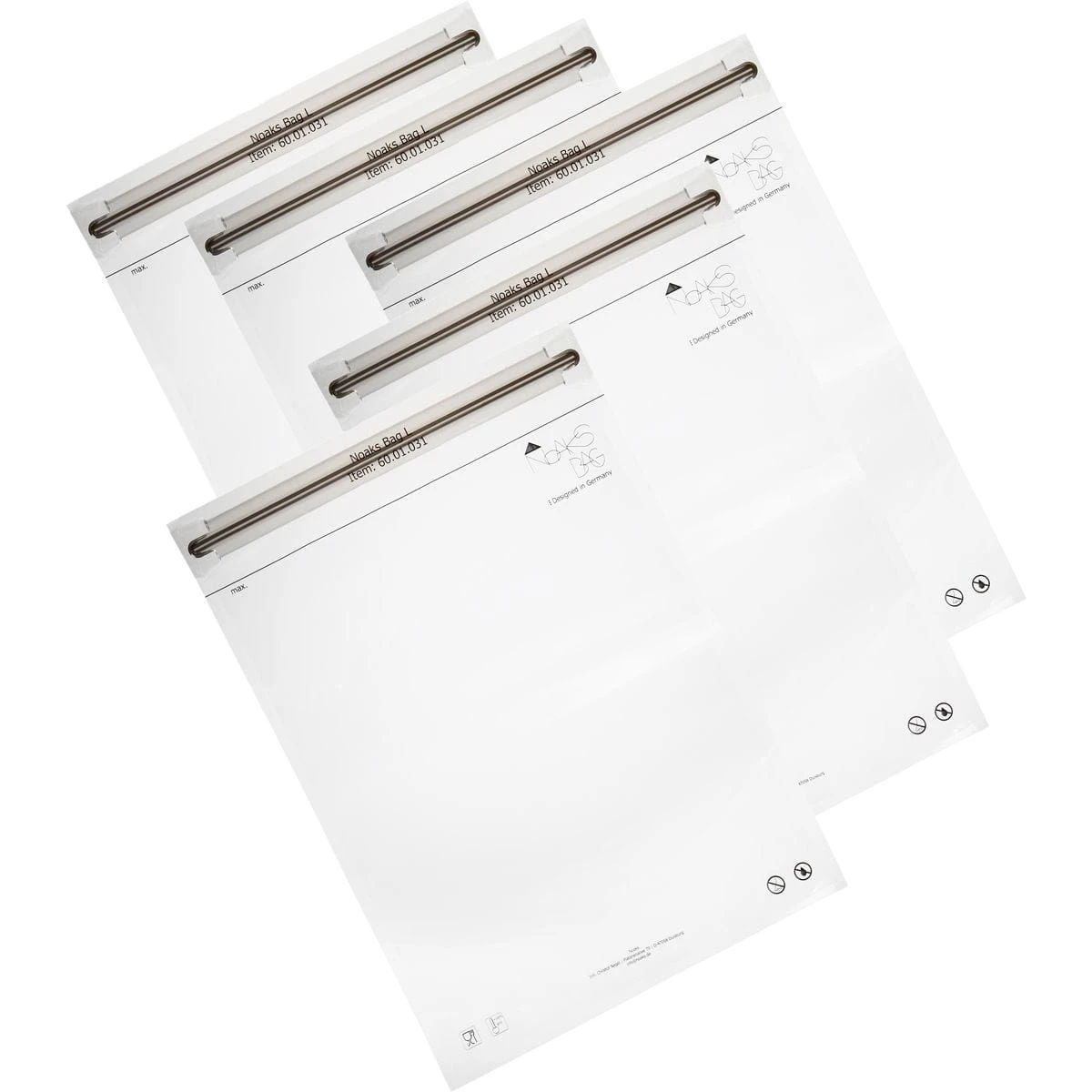 5 Stück Zip-Beutel Bag in der Größe L von NOAKS. Noaks Bags sind das universelle Aufbewahrungsmittel für alle Lebenslagen. Sei es auf Reisen, bei allen Outdoor-Aktivitäten, im Garten, Haushalt oder einfach nur bei schlechtem Wetter. Immer wenn es wirklich dicht sein muss. Die Funktionsfähigkeit von Touch Screens bleibt voll erhalten. Was drinnen ist bleibt drinnen, was draußen ist bleibt draußen. Noaks Bags sind in unterschiedlichen Größen erhältlich. Die Größe L eignet sich hervorragend für Tablets bis 10 Zoll, DIN A4 Dokumente und vieles mehr. Das innovative, 100 mµ starke Verbundmaterial garantiert eine häufige Wiederverwendbarkeit und absolut zuverlässigen Schutz vor allen Umwelteinflüssen wie Wasser, Sand, Staub, Schnee usw.. Darüber hinaus sind sie kinderleicht zu handhaben und garantiert sicher. Die Lebensmittelechtheit ist selbstverständlich labortechnisch bestätigt.