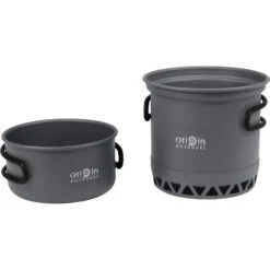 Das sehr leichte Topfset Radiator von Origin Outdoors aus hartanodisiertem Aluminium ist mit einem hocheffizenten Wärmetauscher ausgestattet. Der Wärmetauscher spart Zeit beim Kochen und reduziert den Brennstoffverbrauch. Die stabilen Klappgriffe bieten sicheren Halt beim Kochen. Platzsparend verstaubar, erfolgt der Transport im praktischen Netzbeutel.
