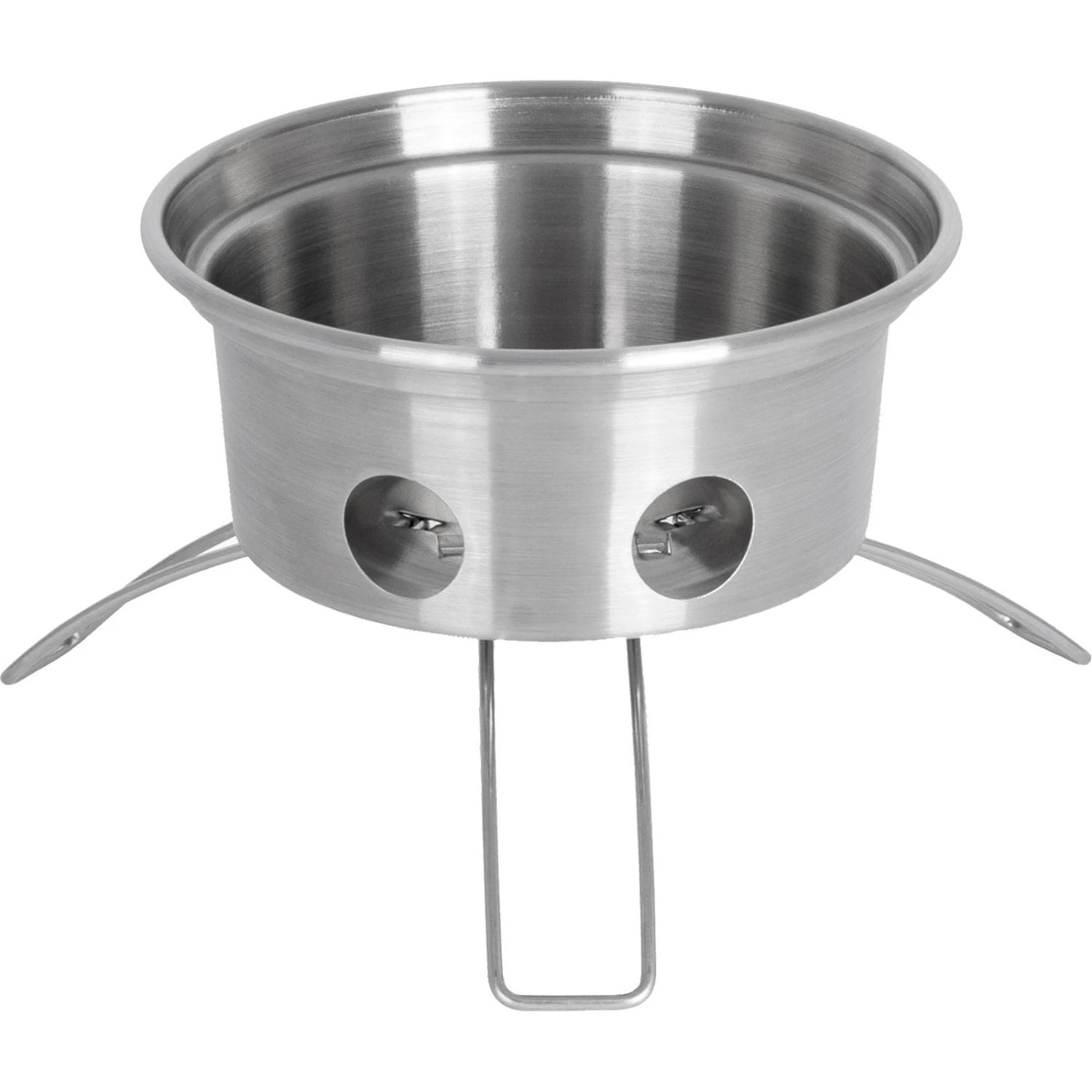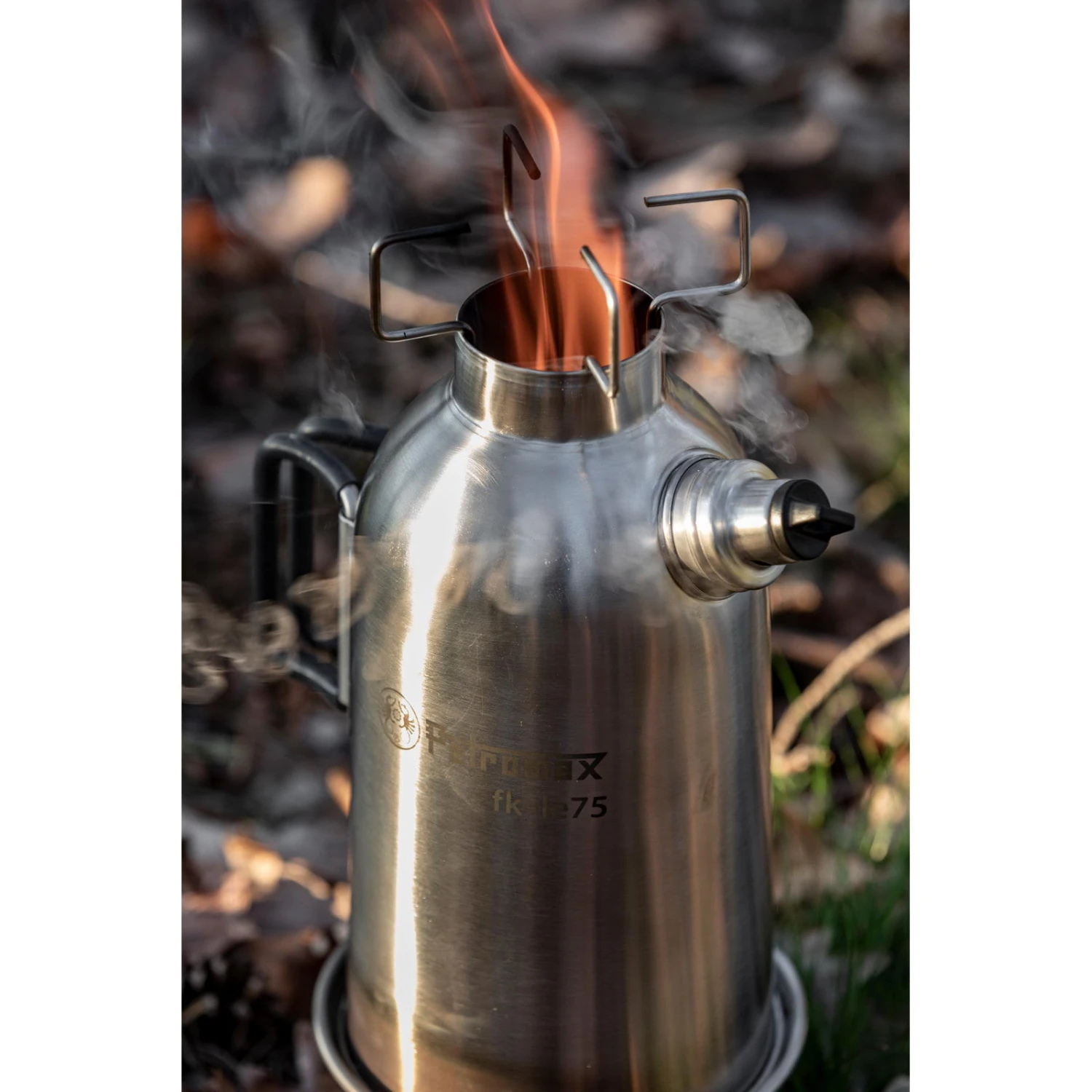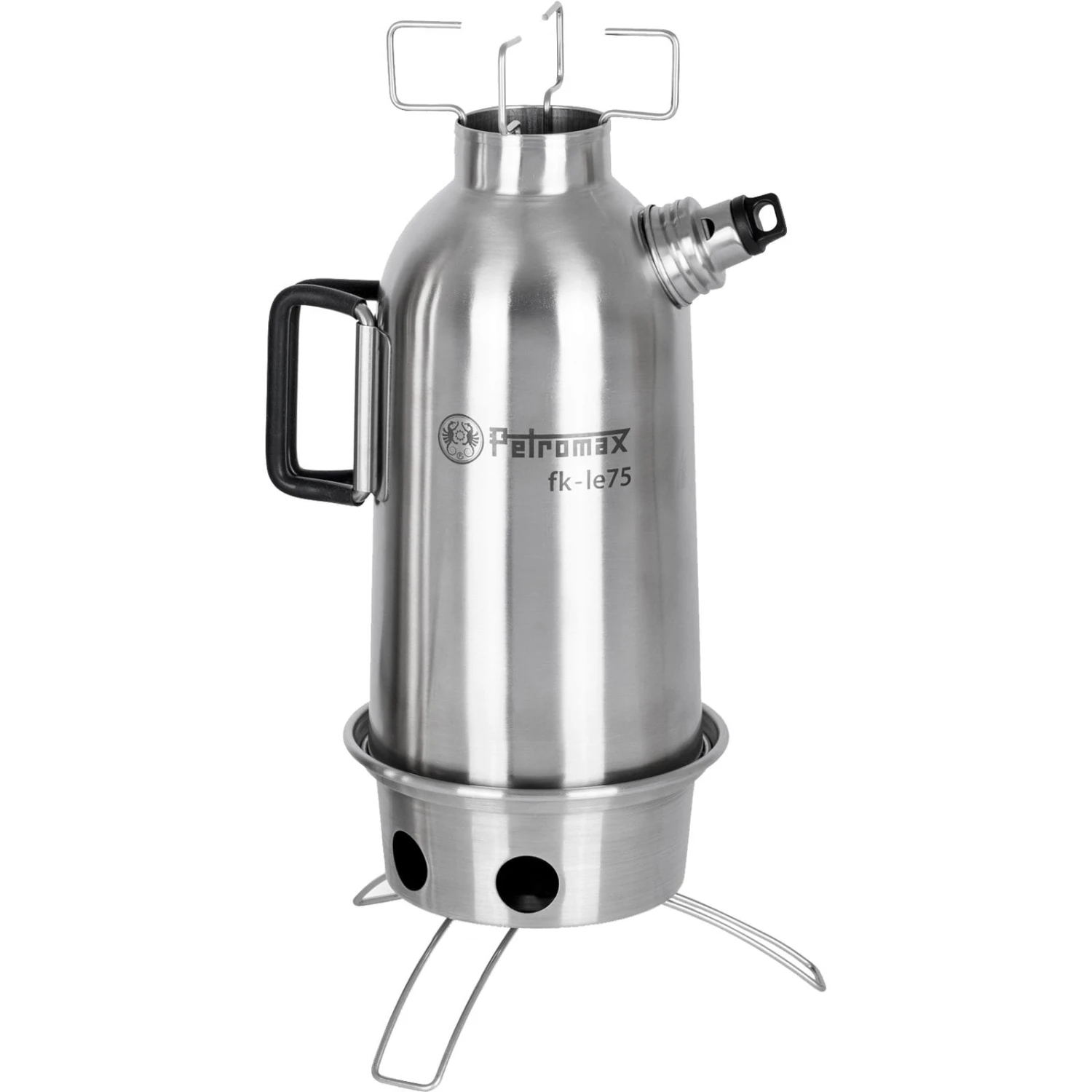 Die Feuerkanne fk-le75 von Petromax besteht aus Edelstahl, sie ist ein autarker Wasser- oder Notfallkocher und bereichert die Outdoorküche. Mit kleinen Ästen, Zweigen oder Tannenzapfen lässt sich die Wasserkanne einfach und in kurzer Zeit befeuern. Das Brennmaterial wird in der Feuerschale entzündet und die Wärme steigt im Hohlraum der Kanne auf. Durch den entstehenden Kamineffekt wird das sich in der Doppelwand befindende Wasser erhitzt und in wenigen Minuten zum Kochen gebracht. Mit einem kräftigen Ton signalisiert die Dampfpfeife, dass das Wasser den Siedepunkt erreicht hat. Der zusätzliche Schraubdeckel sorgt für einen auslaufsicheren Wassertransport und die Feuerschale mit Füßen verleiht der Kanne jederzeit festen Stand. Die Feuerschale inklusive Füße kann zum Transport und zur Lagerung passgenau in der Bodenöffnung der Feuerkanne verstaut werden. Dank der Silikongriffe ist das Entfernen von der Hitzequelle problemlos möglich. Neben Wasser heizt die fk-le75 auch dem Kochgeschirr ein und dient somit als Campingkocher. Der in der Kannenöffnung fixierbare Kochaufsatz bietet Platz für kleine Töpfe und Kessel. Die an der oberen Öffnung entweichende Wärme kann dabei genutzt werden, um kleine Mahlzeiten zu erhitzen.