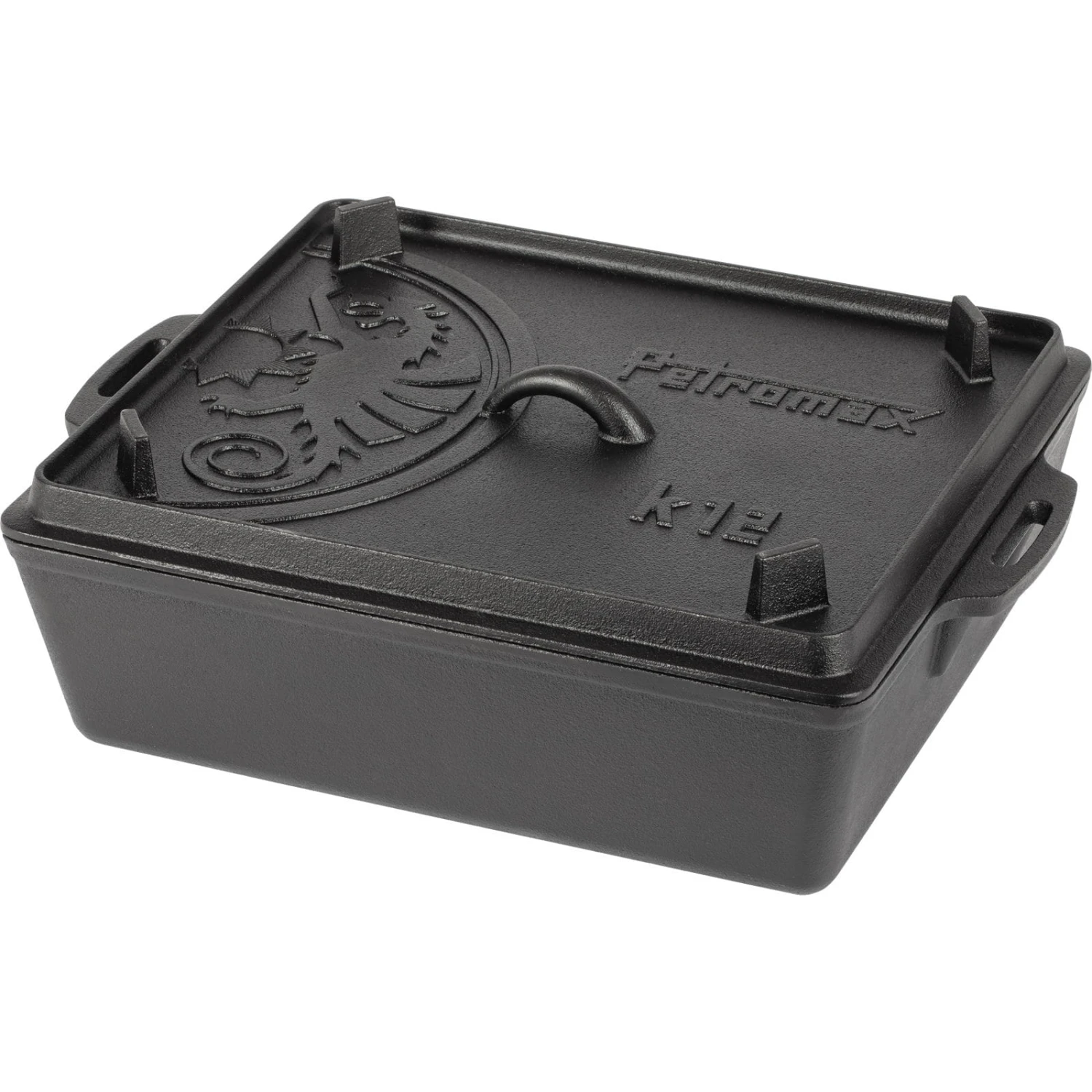 Mit der extragroßen Kastenform k12 versorgt man eine ganze Mannschaft in der Lagerfeuer-Küche. In der mit 8 Liter Füllvolumen geräumigen Form aus hochwertigem Gusseisen gelingen Brot mit krosser Kruste, überbackene Aufläufe und alle Arten von Fleischgerichten. Marinierten Wildschweinbraten mit Rotwein-Preiselbeer-Soße und Beilagen bereitet man in der sofort einsatzbereiten Kastenform aus Gusseisen ebenso zu wie Lasagne oder klassischen Kartoffelauflauf für eine große Gruppe von Draußen-Abenteurern. Der k12 ist ideal als Bräter, Auflaufform oder zum Brot- und Kuchenbacken. Mit dem Deckelheber (optional erhältlich, RL.402404) lässt sich der Deckel einfach und gefahrlos abnehmen. Dieser besitzt ein Rillenprofil, wodurch er auch als Steak- und Grillpfanne gut geeignet ist.
