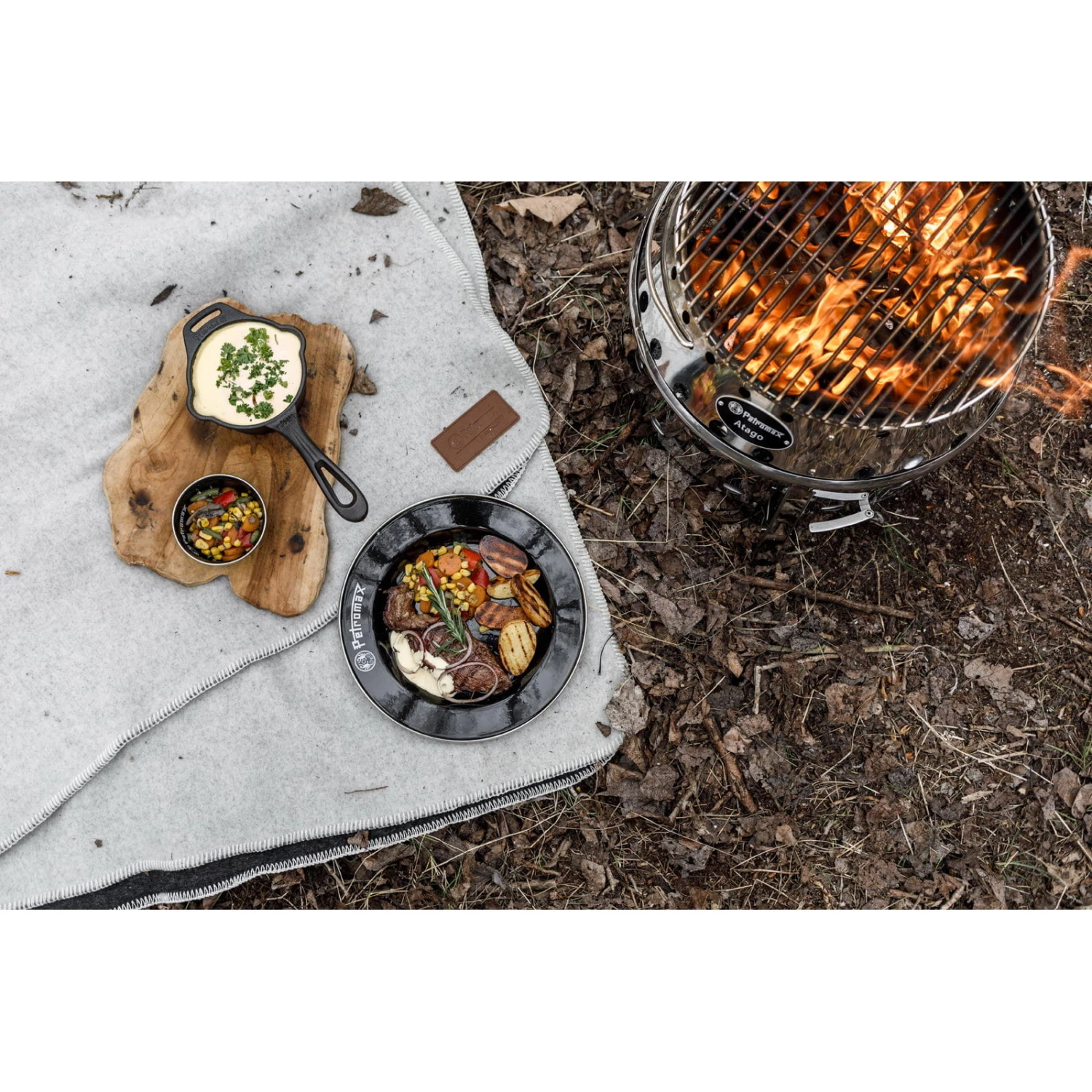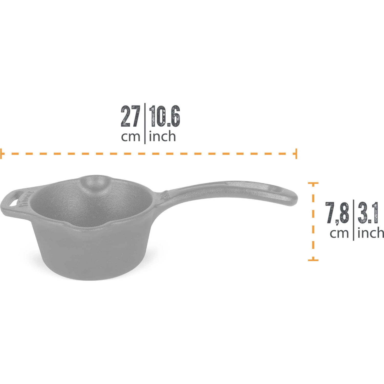 Der Petromax Saucentopf erleichtert das Ansetzen von Mehlschwitzen, Fonds oder anderen Saucengrundlagen in deiner Draußen-Küche dank seiner handlichen Form mit Stiel. Auch für das Schwenken von geschmorten Zwiebeln oder das Zubereiten von brauner Butter ist der Saucentopf ideal. Auch kleine Mahlzeiten können darin in Portionsgröße erwärmt werden. Auf intensiven Geschmack und echten Charakter kannst du dabei zählen, denn dank des Gusseisens bekommt auch der kleinste Sattmacher eine besonders charakteristische Note. Die wärmespeichernden Eigenschaften halten deine Sauce oder Zwischenmahlzeit noch lange nach dem Entfernen der Hitzequelle warm und die Ausgießhilfe ermöglicht dir zielsicheres Servieren. Der Saucentopf wird bereits voreingebrannt geliefert und ist für alle Herdarten und das offene Feuer geeignet.