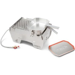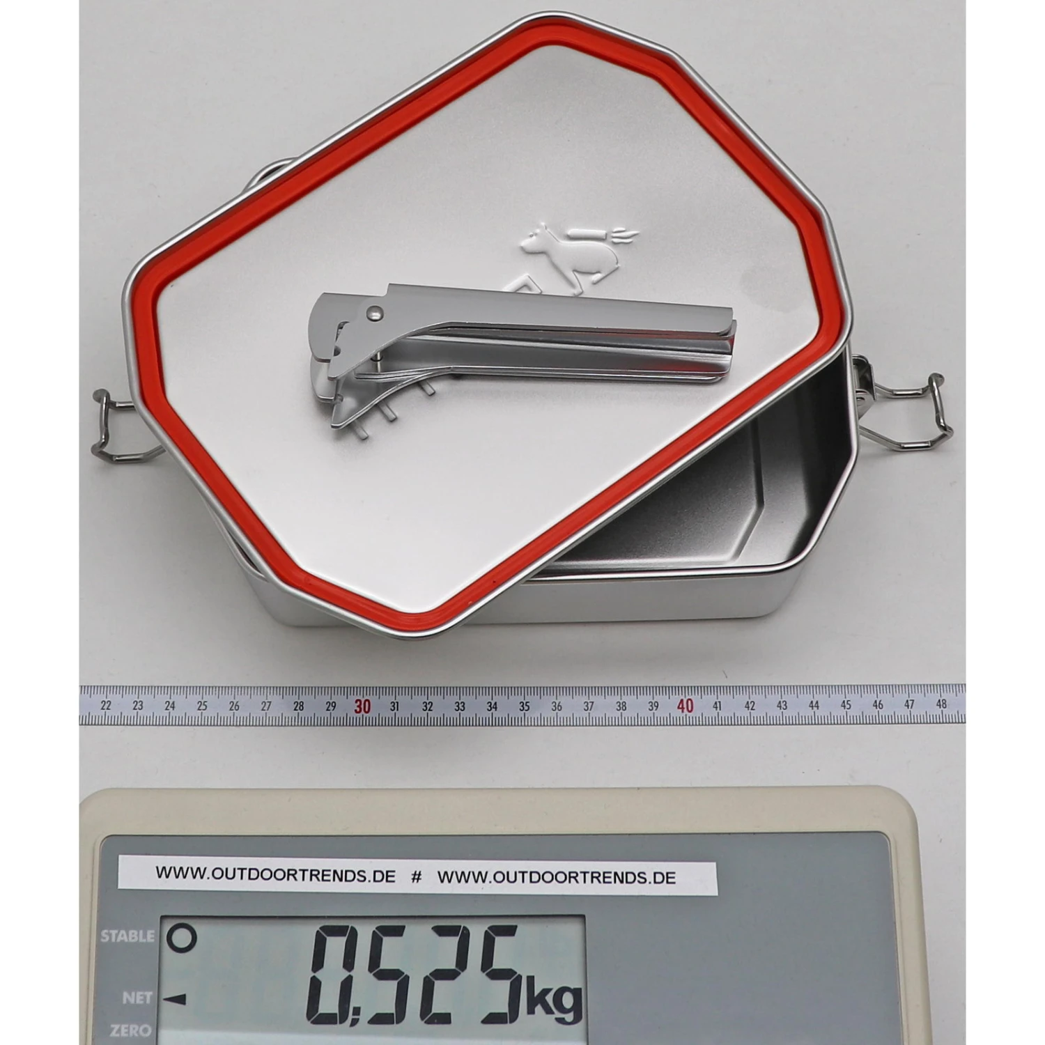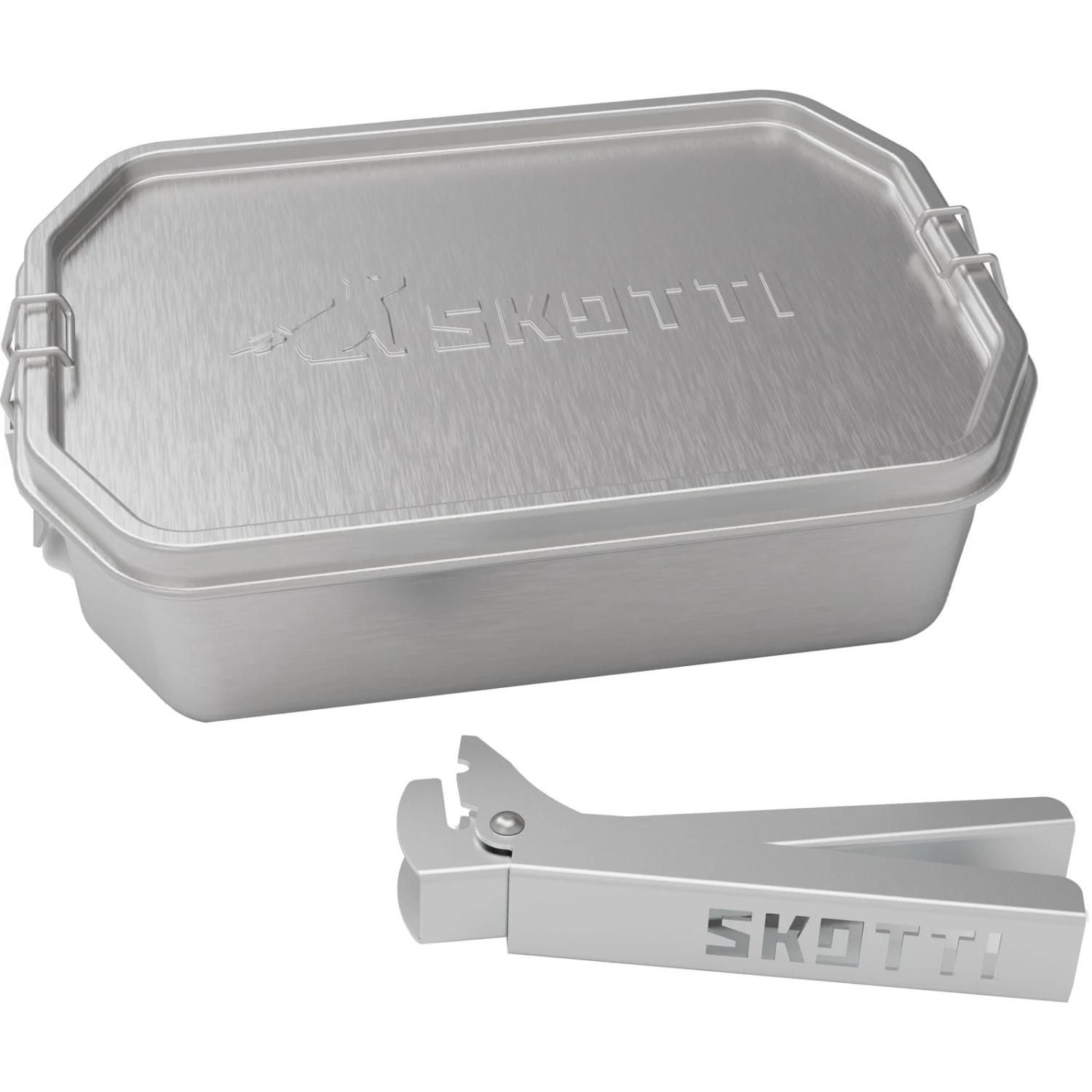 Transportieren, Kochen, Braten – mit der SKOTTI Boks aus Edelstahl wird aus dem SKOTTI Grill eine Outdoor-Küche to go! Jeder BOKS liegt eine stabile Griffzange aus Aluminium bei, mit der man Deckel und Dose jeweils sicher heben und so als Topf oder Pfanne auf dem SKOTTI Grill benutzen kann. Der Boden der BOKS braucht genau die Hälfte des SKOTTI Grillrosts – während die Nudeln kochen, die Currysauce blubbert oder die Zwiebeln schmoren, kann man nebenan bequem weiter grillen. Natürlich kann man seine SKOTTI Boks auch einfach als eine absolut robuste, umweltfreundliche und langlebige Alternative zu einer Vorratsdose aus Kunststoff nutzen. Ein passgenauer Dichtungsring aus Silikon verhindert das Auslaufen von Flüssigkeiten wenn sie aufrecht steht, zwei besonders starke Verschlussklemmen an den Seiten sorgen dafür, dass sich die SKOTTI Boks nicht versehentlich unterwegs in der Tasche oder dem Rucksack öffnet. So ist die SKOTTI Boks die perfekte Ergänzung für ein kleines Outdoor-Abenteuer, aber ebenso eine optimale Lunchbox für einen Arbeitstag, für die Uni oder Schule. Hinweis: die Aluminiumzange darf, wie alles aus Aluminium, nicht in die Spülmaschine!