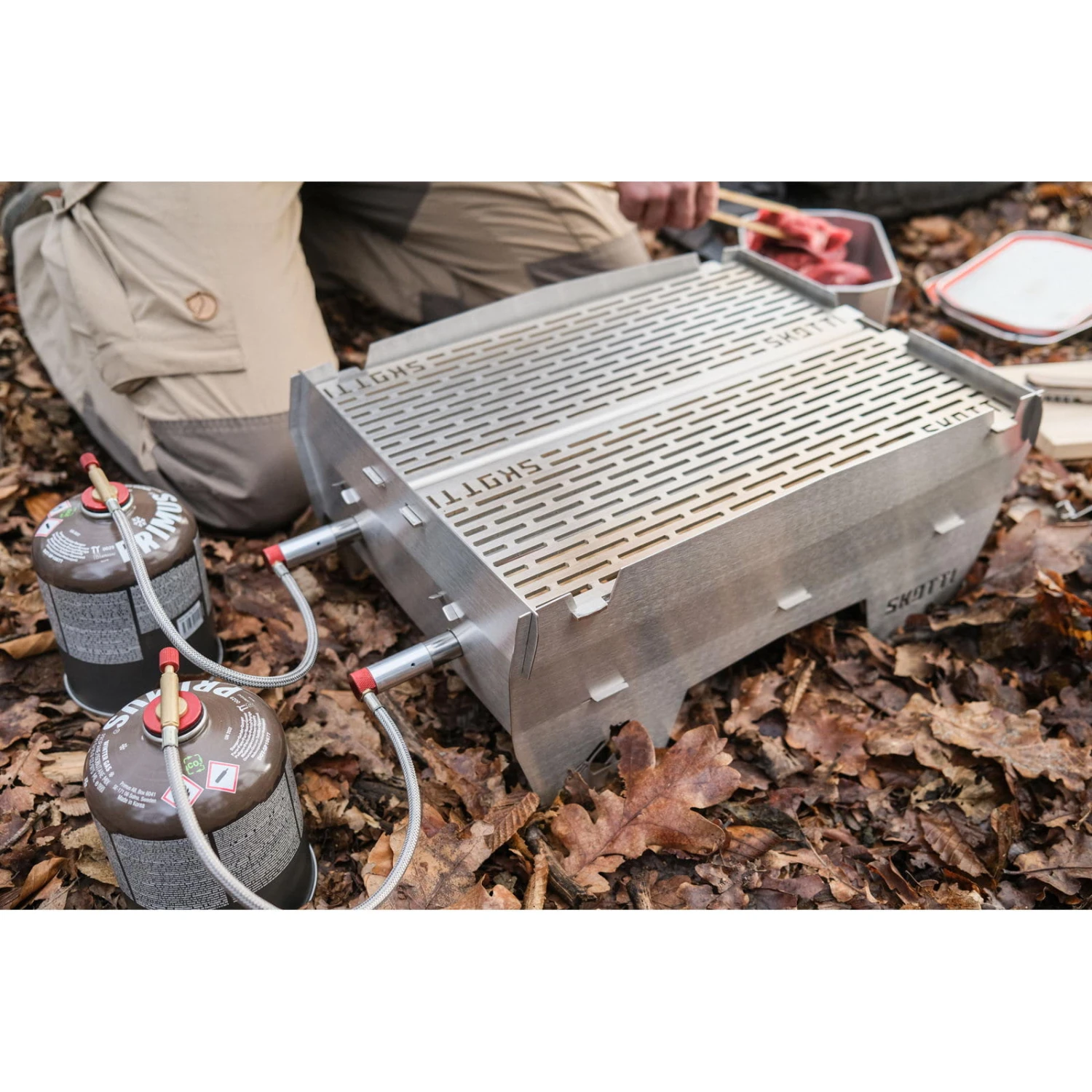 Der Skotti Grill Max ist für alle, die es etwas größer mögen. Seine Grillfläche ist mit 39,5 x 30 cm (A3) doppelt so groß wie die des Skotti 2.0, das Packmaß des neuen großen Bruders ist jedoch dank des mittig geteilten Grillrosts kaum größer, dadurch ist der Skotti Max unterwegs ebenso flexibel. Er besteht aus 14 Edelstahlteilen, die schnell und ohne Werkzeug zusammengesteckt werden. Über zwei parallele Brennerrohre wird die Grillfläche mit Hitze versorgt, die Gaszufuhr jeweils einzeln reguliert. Dadurch lassen sich auf dem Grillrost unterschiedliche Temperaturzonen herstellen, z.B. eine für besonders scharfes Anbraten und eine für langsames Garen bei niedriger Hitze. Skotti bleibt sich auch in der Max Variante treu. Sauberes, sicheres Grillen mit Gas und ein handliches Packmaß, das in jedem Camper, Kofferraum oder Gepäckträger Platz findet. Für größere Familien, Camping-Reisende und einfach alle, die gerne mit vielen Freunden grillen, ist der Skotti Max mehr als perfekt.
