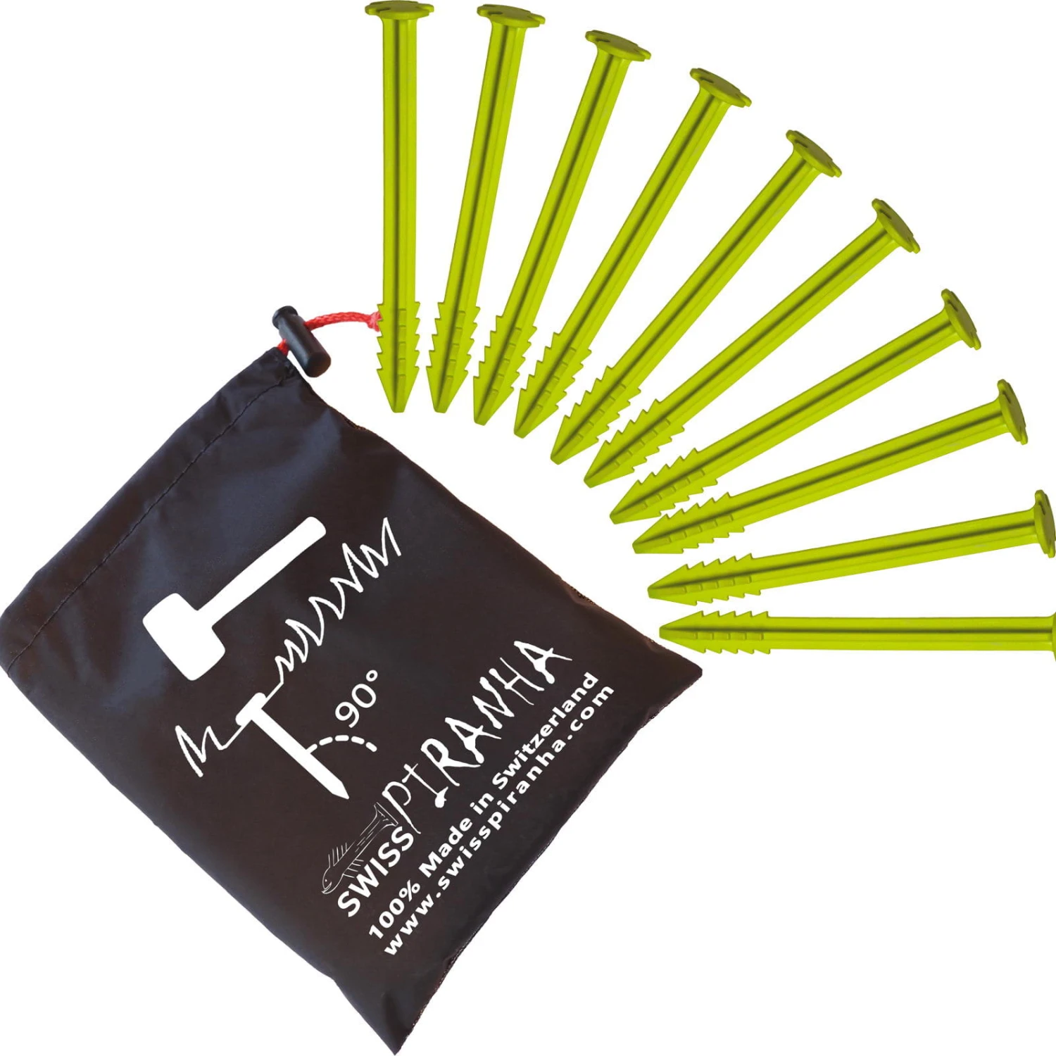 Innovativ und in der Schweiz hergestellt, bieten die veganen Heringe aber noch weitere Vorteile. Sie sind ultraleicht, stoßfest, supersicher und aufgrund ihres flachen Profils besonders fußfreundlich. Ihre spitz zulaufende Form ermöglicht ein einfaches Einschlagen, ohne dass scharfe Kanten entstehen, die das Zeltgewebe beschädigen. Ihr x-förmiger Querschnitt mit Sägezahnprofil sorgt für sicheren Halt in unterschiedlichsten Böden. SwissPiranha-Heringe werden flach im Boden versenkt, wodurch keine Stolper- und Verletzungsgefahr besteht. Ideal für Familien, da sich spielende Kinder nicht am Hering verletzen können. Zusätzlich verdichtet der flache Kopf den Untergrund und sorgt so für eine deutlich höhere Ausreißkraft. Einkerbungen halten die Zeltleinen zuverlässig am Platz und sorgen für beste Verankerung. Ausgediente GreenShark-Heringe können wieder recycelt werden und sind sogar biologisch abbaubar und kompostierbar. Die Zeltheringe GS120 werden im praktischen Stoff-Packsack geliefert.