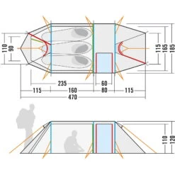 Merkmale: Tunnelzelt mit drei Gestängebögen und Apside; Himmeltasche; Herausnehmbare Tasche in der Apside; Seitlicher Eingang in die Apside mit separat verschließbarem Moskitonetz; Drei Eingänge in das Außenzelt; Zwei Lüfter im Außenzelt; Wasserdicht versiegelte Nähte; Wasserdichte Verarbeitung der Abdeckungen, Lüfter und Ansatzpunkte; Reflektoren an den Zeltleinen; Praktische Packhilfe für Zeltleinen; Verstärkte Eckpunkte mit Gurtbandschlaufen; Extra langes Innenzelt (235 cm) für mehr Liegekomfort; Zwei Eingänge in das Innenzelt, einer davon mit separat verschließbarem Moskitofenster; Zwei Einstecktaschen im Innenzelt neben dem Eingang; Bequeme Einstecktasche in Greifhöhe am Fußende; Wäscheleine im Innenzelt; Lüfter im Innenzelt; Eloxiertes Aluminium-Zeltgestänge; Inklusive Packsäcke für Zelt und Gestänge