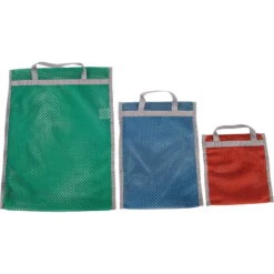 Im praktischen Netztaschen-Set Mesh Pocket III von TATONKA verstaut man kleine und größere Reiseutensilien geordnet und übersichtlich in Koffer, Reisetasche oder Rucksack. Die flachen Packbeutel besitzen die Maße 16 x 9 cm, 20 x 29 cm und 29 x 40 cm und sind mit Handschlaufe und Reißverschluss versehen.