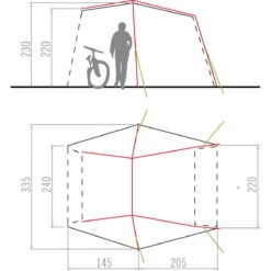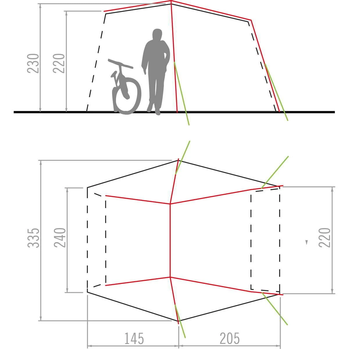 Merkmale: selbststehend und rundherum verschließbar (z.B. bei Tagesausflügen); Busvorzelt für kleinere Busse und Vans mit Dachreeling und einer Höhe zwischen 165 und 200 cm; selbststehende Konstruktion zum Andocken an das Fahrzeug; passend für Vans und Kombis sowie Campingfahrzeuge mit Funktionsleiste; Befestigung am Dach mit Hilfe von Saugnäpfen; Innenzelt und Zeltboden als optionales Zubehör erhältlich