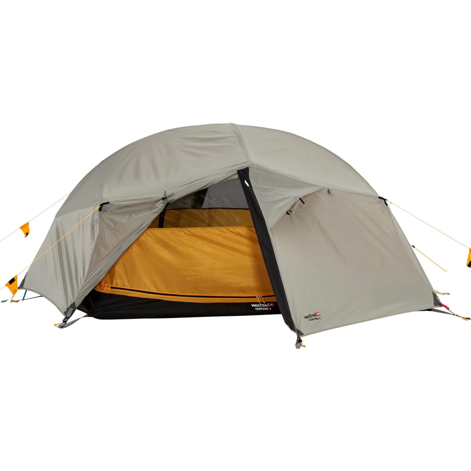 Das Venture 3 von Wechsel Tents ist ein geräumiger und gleichzeitig kompakter Geodät für drei Personen mit zwei Eingängen und zwei Apsiden. Das Innenzelt des Venture 3 wird zuerst aufgebaut. Das unvergleichliche Stangendesign sichert die strukturelle Stabilität für einen zuverlässigen Einsatz während der drei Jahreszeiten und erhöht sowohl das Platzangebot im internen Wohn- als auch im Apsidenbereich. Das Innenzelt ist in den Türen sowie am Fuß- und Kopfende mit Mosquitogazen ausgestattet, die für eine optimale Belüftung sorgen. Die großzügig geschnittenen Türen machen das Ein- und Aussteigen besonders komfortabel. Innenzelttaschen sorgen für Ordnung und bieten Platz für sonst herumliegenden Kleinkram. In seiner Größenordnung ist das Venture 3 mit 3,08 kg (inkl. Packsack) ein Leichtgewicht.
